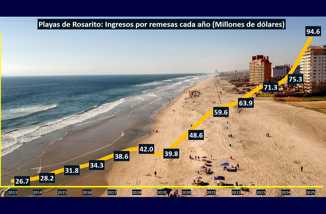 Los resultados del banco central revelan la llegada de 94.6 millones de dólares de remesas de los connacionales a familiares que habitan Playas de Rosarito para superar los 75.3 millones de dólares que recibieron en 2024.