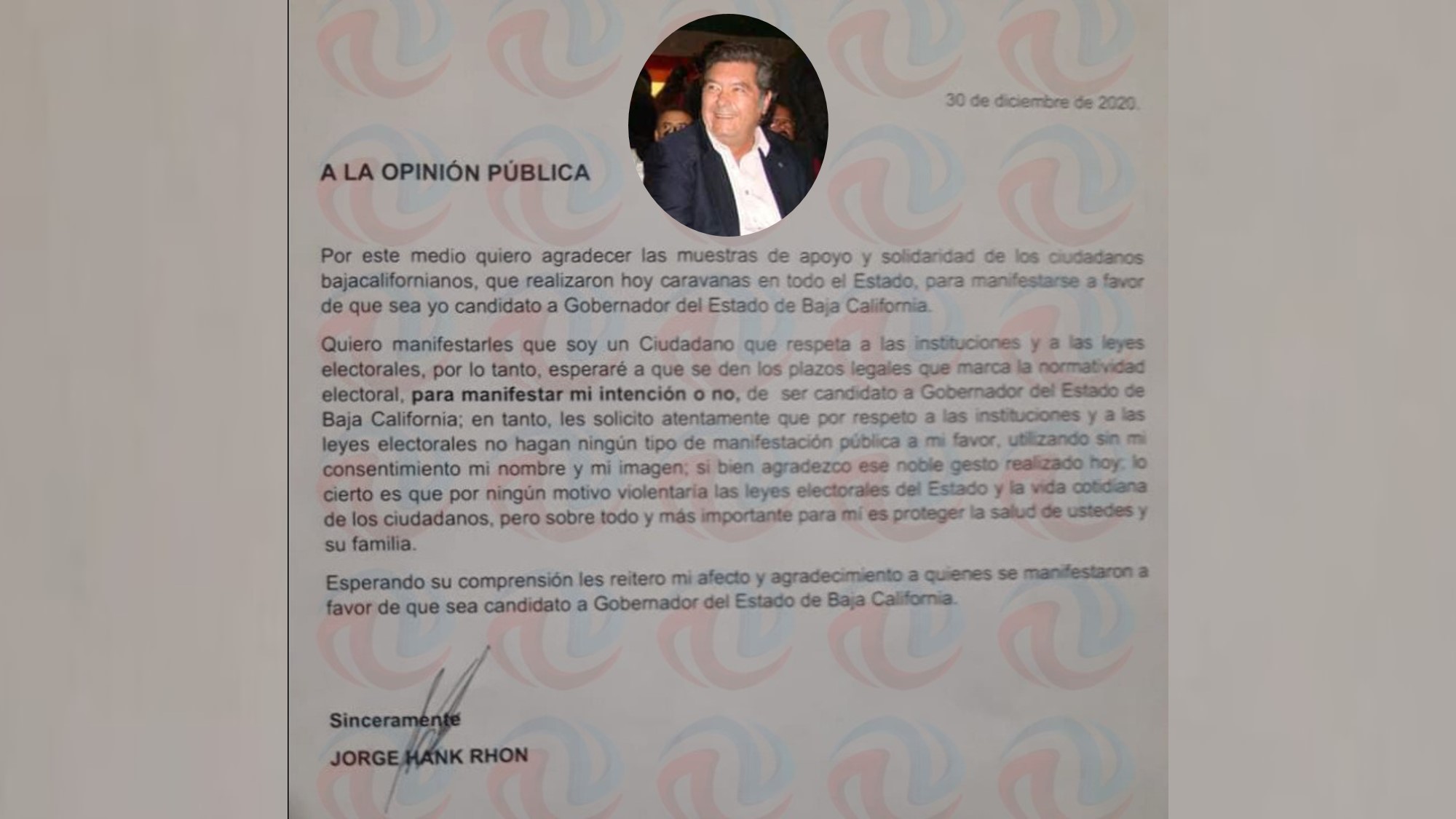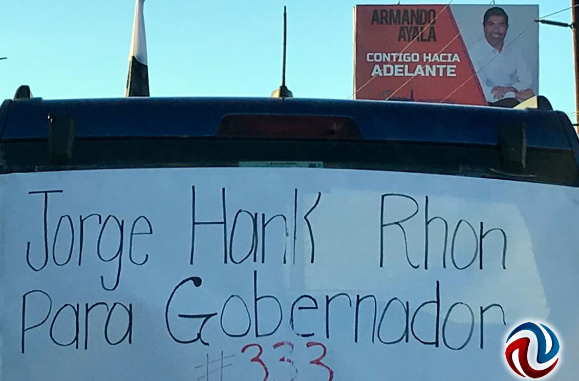 En el mensaje emitido por Jorge Hank, este aprovechó para agradecer las muestras de apoyo y solidaridad que sus colaboradores y simpatizantes (a los que llamó “ciudadanos bajacalifornianos”) realizaron, en caravanas en todo el Estado, para manifestarse a favor: “de que sea yo -dijo- candidato a gobernador del Estado de Baja California”.