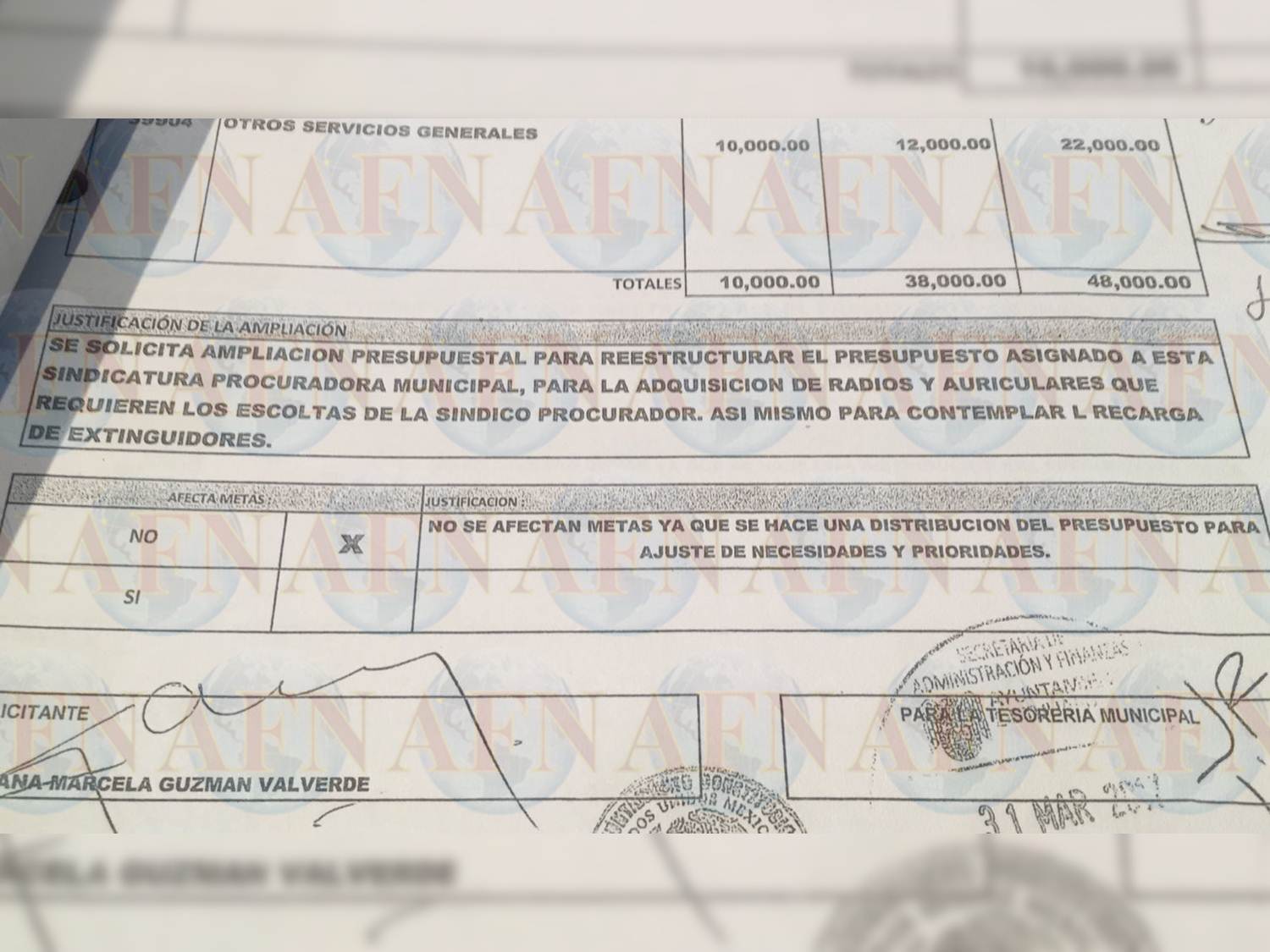 La funcionaria solicitó poco más de $100,000 pesos, que se dividieron en por lo menos 4 rubros, uno de los cuales es para dotar de radios y auriculares a sus escoltas, que aparentemente son varios, para lo cual destinará $10,000 pesos; además, dijo requiere algunos de esos ingresos para “la recarga de extinguidores”, (extintores).