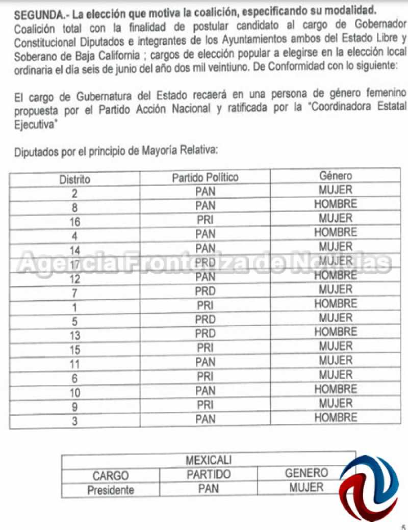 En los acuerdos establecidos se determinó que los cargos de presidente municipal y síndico procurador en Mexicali, serán respectivamente para una mujer del PAN y un hombre del mismo partido; en Tijuana, para un hombre del PRD y un síndico del mismo partido; en Ensenada, la presidencia municipal para una mujer del PAN, y la sindicatura para un caballero del mismo partido; Tecate, la presidencia municipal será para una mujer del PRI, y un hombre del PAN, como síndico; y en Playas de Rosarito, la presidencia municipal para un hombre del PRI, y una mujer panista como síndico.
