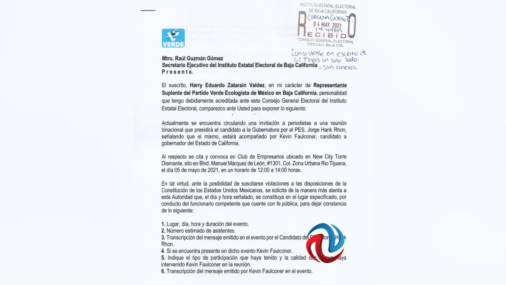 El representante suplente del Partido Verde, Harry Eduardo Zatarain Valdez, dirigió un documento al Instituto Estatal Electoral, informando sobre esta pretendida reunión, y solicitando que, en el día y hora señalados se constituyera en el lugar especificado, un funcionario competente del IEE, que “cuente con fe pública” para dejar constancia de datos muy precisos.