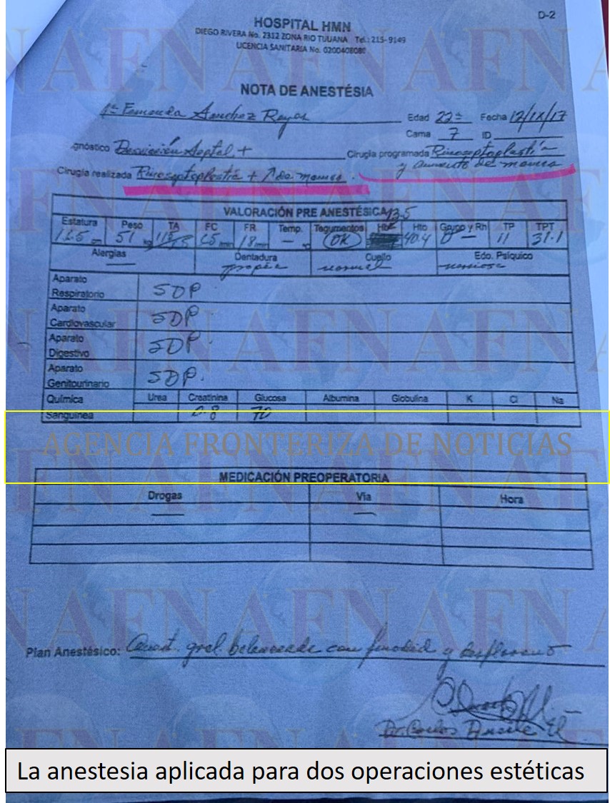 Este caso, al margen de desarrollar un poco más los anteriores asuntos, es interesante, porque la chica tiene 24 años de edad; tenía 22 cuando el 12 de septiembre de 2017 se le canalizó al Hospital de la Mujer y el Niño (HMN) ubicado en Diego Rivera número 2312 de la Zona Río Tijuana, bajo el supuesto diagnóstico de síndrome Poland y desviación septal, pero en lugar de solicitar una septoplastia que es la que se practica para corregir la desviación del tabique nasal, según la orden para la aplicación de la anestesia, se emitió para ser sometida -de manera simultánea- a una rinoplastia, que es una cirugía estética de nariz, y al aumento de mamas, que no tengo que explicarles que se refiere a implantes para aumento de senos.