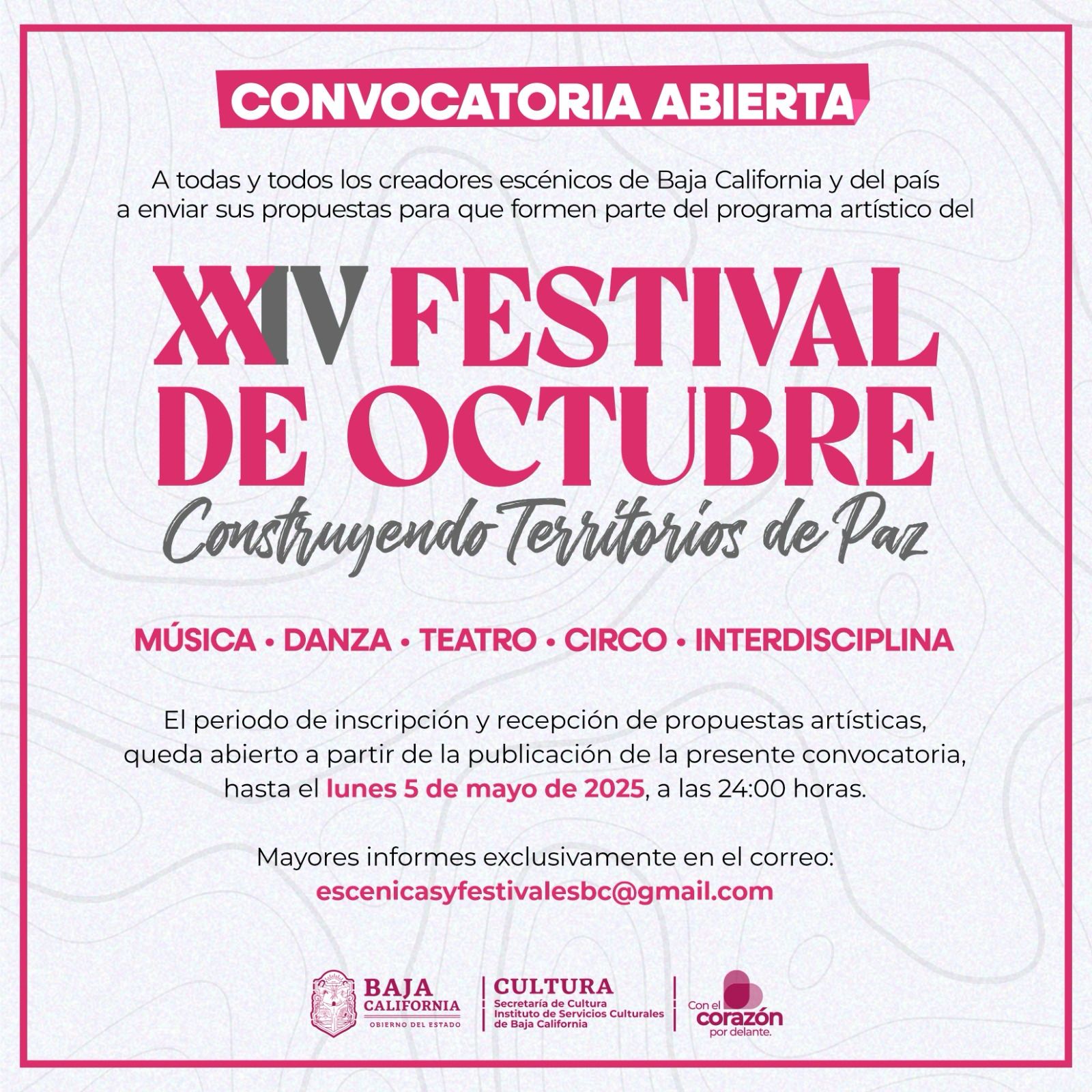 TIJUANA BC 4 DE ABRIL DE 2025 (AFN).– La Secretaría de Cultura del Estado abrió la convocatoria para la XXIV edición del Festival de Octubre “Construyendo Territorios de Paz”, dirigida a creadoras y creadores escénicos de Baja California y del resto del país.