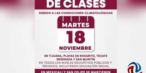 MEXICALI BC 17 DE NOVIEMBRE DE 2025 (AFN).- Suspenderán clases este martes 18 de noviembre en planteles educativos de Tijuana, ...