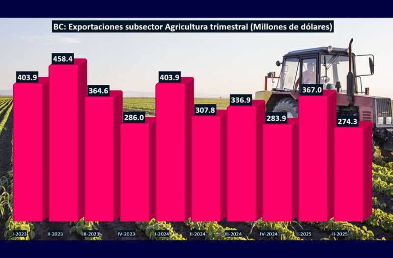 TIJUANA BC 24 DE OCTUBRE DE 2025 (AFN).- Las exportaciones de mercancías del subsector de Agricultura en Baja California registraron una contracción del 11% a tasa anual al segundo trimestre de 2025 respecto al mismo periodo, pero del 2024, de acuerdo con las cifras del Instituto Nacional de Estadística y Geografía (INEGI).