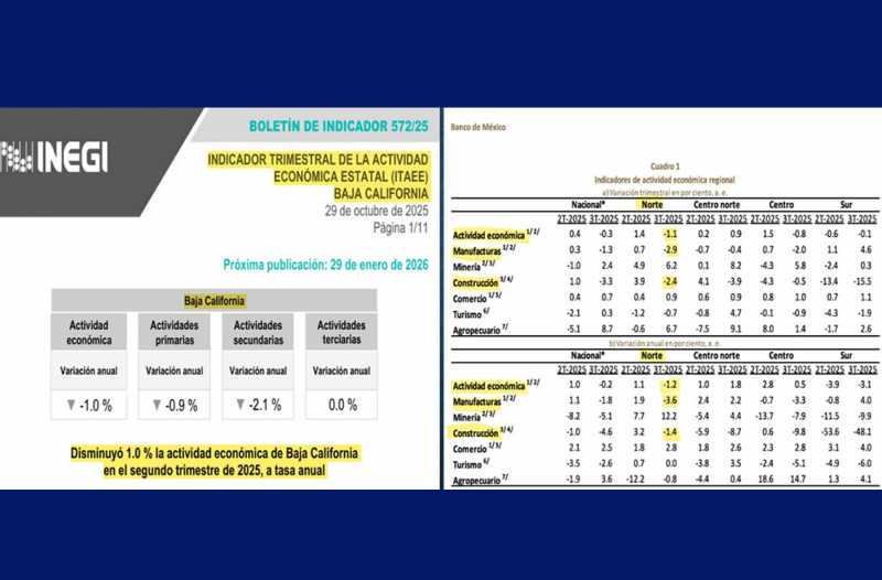 Si bien, hasta el próximo año se actualiza el Indicador Trimestral de la Actividad Económica Estatal (ITAEE) para el tercer trimestre de 2025, por parte del INEGI, la información del Banxico en su reporte sobre Economías Regionales para el periodo julio-septiembre del presente año perfila a Baja California hacia una recesión.