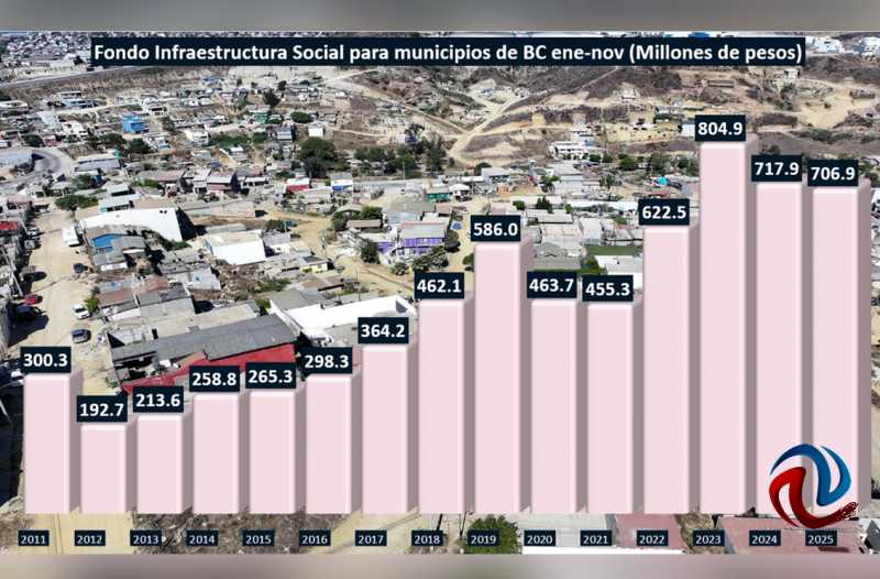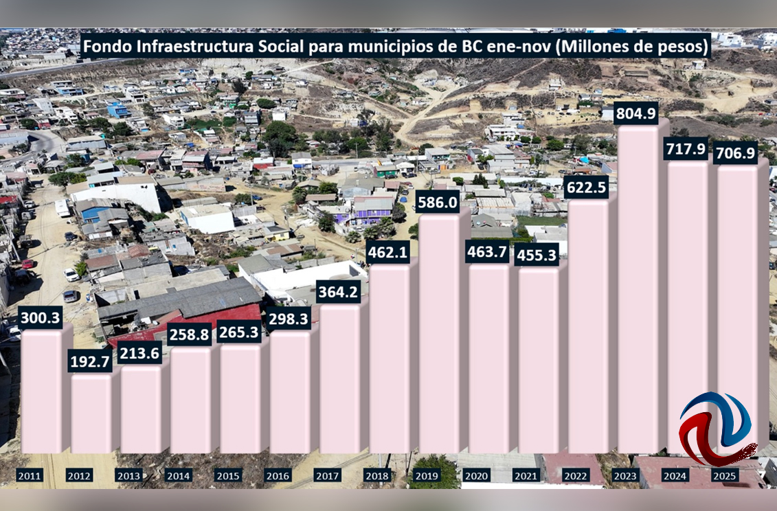 TIJUANA, BC, 15 DE ENERO DE 2026 (AFN).- Los municipios de Baja California sufrieron un recorte del 5.1% real a tasa anual en los recursos destinados para Infraestructura Social al 31 de noviembre de 2025 en comparación al 2024, arrojan las transferencias publicadas por la Secretaría de Hacienda y Crédito Público (SHCP).