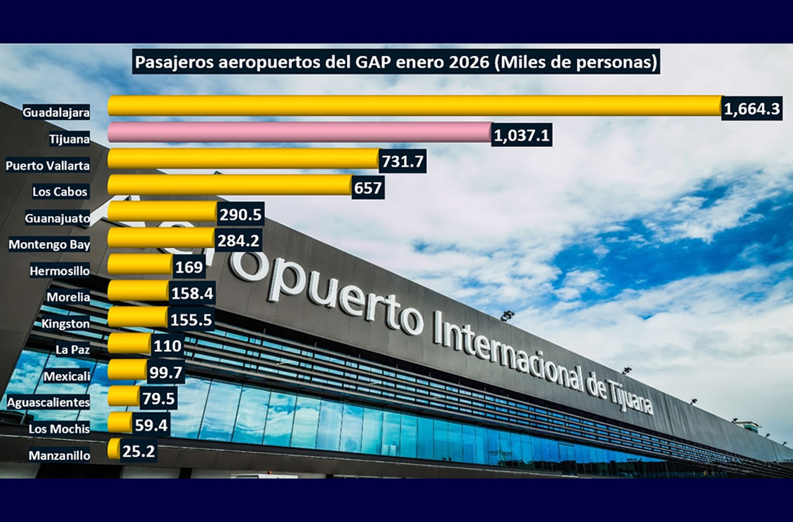 TIJUANA BC 11 DE FEBRERO DE 2026 (AFN).- En Tijuana, el tráfico de pasajeros por avión registró una caída del 4.2% a tasa anual durante enero de 2026 respecto al mismo lapso, pero del año anterior, de acuerdo con las cifras del Grupo Aeroportuario del Pacífico (GAP).