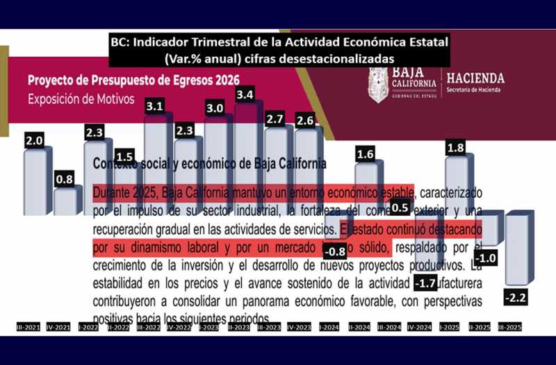 En el documento que la Secretaría de Hacienda de Baja California entregó al Congreso del Estado en diciembre 2025, para justificar el paquete fiscal 2026 por ingresos con un importe por 92 mil 118.5 millones de pesos, se basó en información desactualizada sobre la actividad económica local.