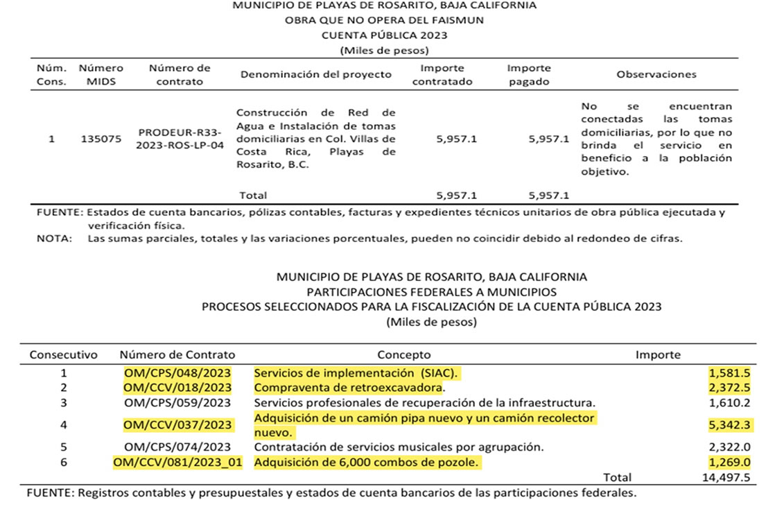 En el primero de los dos pliegos de observaciones, el organismo fiscalizador documentó que la alcaldía de Playas de Rosarito incurriría en un probable daño o perjuicio, o ambos, a la Hacienda Pública por un monto de 10,565,258.69 pesos (diez millones quinientos sesenta y cinco mil doscientos cincuenta y ocho pesos 69/100 M.N.), más los rendimientos financieros generados desde su disposición hasta su reintegro en la cuenta bancaria de las Participaciones Federales a Municipios, por la falta de documentación justificativa que acredite que el servicio contratado se realizó conforme a lo estipulado en el contrato número OM/CPS/048/2023; respecto a los contratos con números OM/CCV/018/2023 y OM/CCV/037/2023.