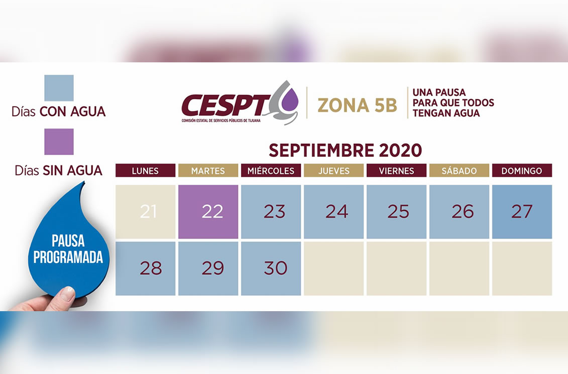 TIJUANA BC 21 DE SEPTIEMBRE DE 2020 (AFN).- Los tandeos programados para la regularización del servicio de agua potable organizados por la Comisión Estatal de Servicios Públicos de Tijuana (CESPT), continuarán de la siguiente manera.