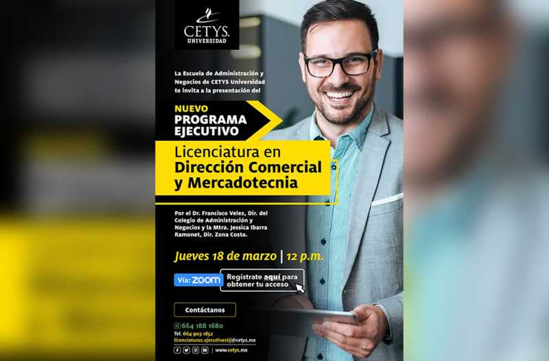 TIJUANA BC 17 DE MARZO DE 2021 (AFN).- La escuela de Administración y Negocios de Cetys Universidad, dará a conocer su nuevo programa ejecutivo, con el lanzamiento de la nueva Licenciatura en Dirección comercial y Mercadotecnia.