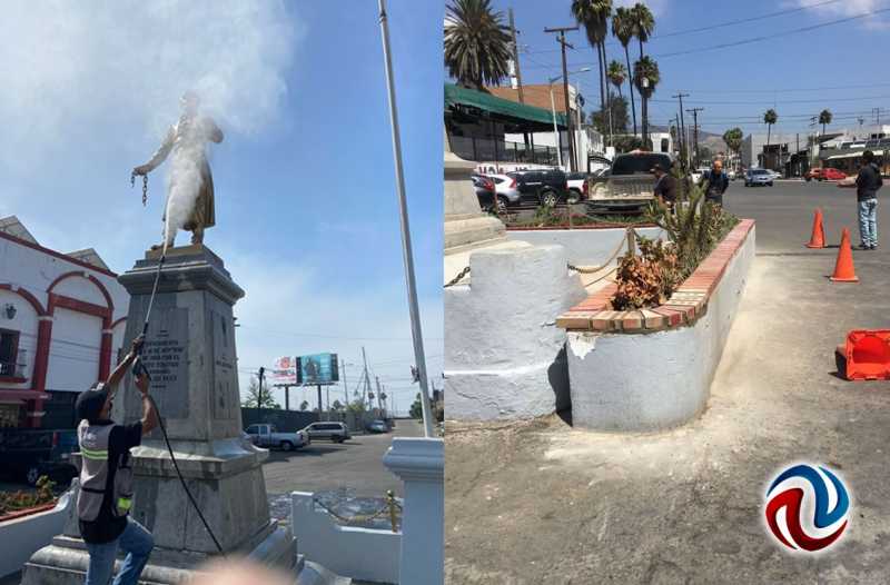 ENSENADA BC 6 DE SEPTIEMBRE DE 2021 (AFN). - Cuadrillas de la Dirección de Servicios Públicos Municipales trabajaron en la rehabilitación de la barda perimetral del monumento a Miguel Hidalgo, ubicado en la Zona Centro de la ciudad.