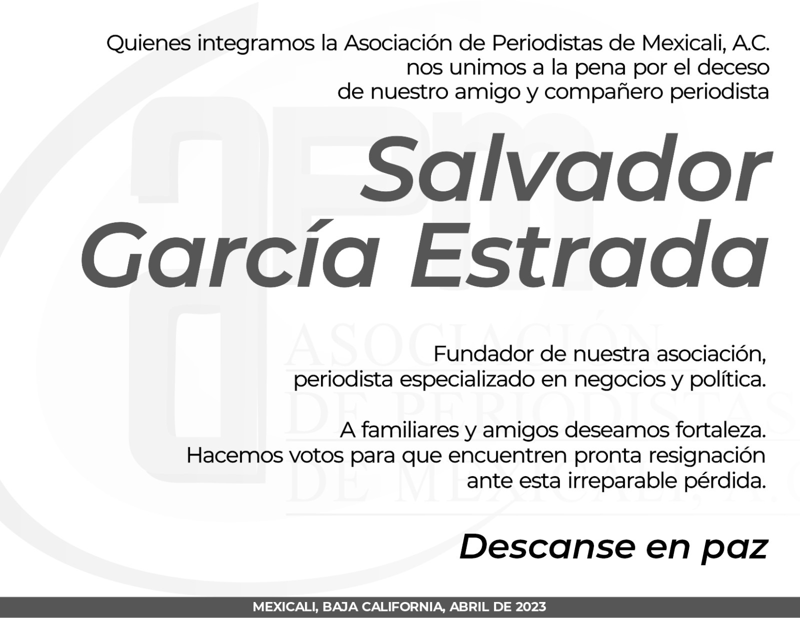 MEXICALI BC 11 DE ABRIL DE 2023 (AFN).- Este martes falleció en Mexicali el periodista Salvador García Estrada, columnista de temas políticos y fundador del diario La Voz de la Frontera.