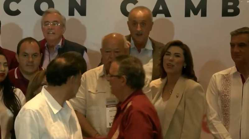 Esa imagen muestra cuando Ebrard llega a la zona del templete donde se encuentran los gobernadores y directivos del partido y, saluda al titular del gobierno de Baja California Sur sin poner mayor atención a la gobernadora local.