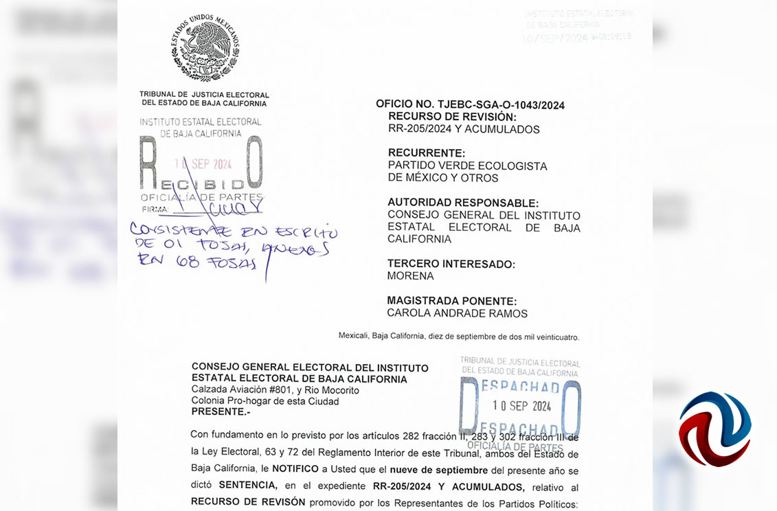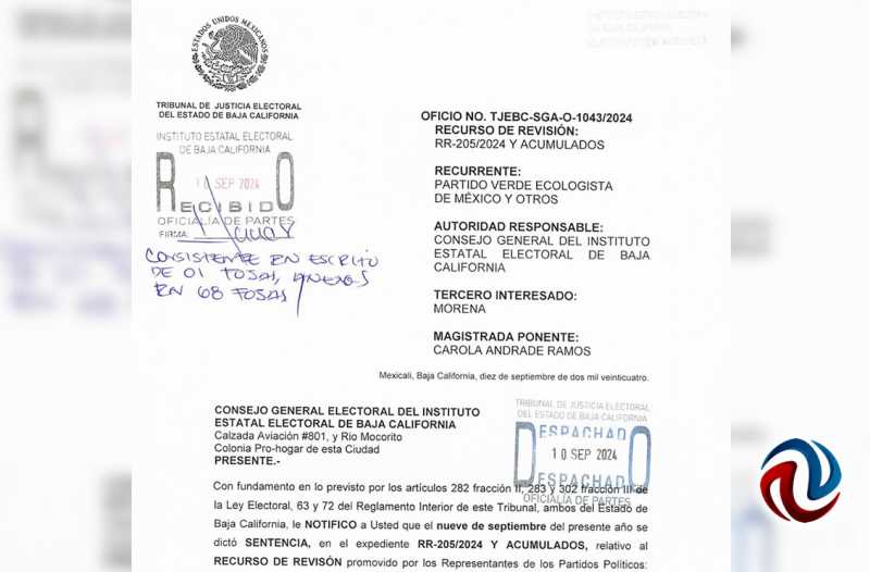 MEXICALI BC 10 DE SEPTIEMBRE DE 2024 (AFN).- El Tribunal de Justicia Electoral de Baja California emitió el documento donde asienta la nulidad de la elección de munícipes para el puerto de San Felipe, y ordena una elección extraordinaria, dejando sin efecto las constancias de mayoría entregadas a la planilla encabezada por MORENA.