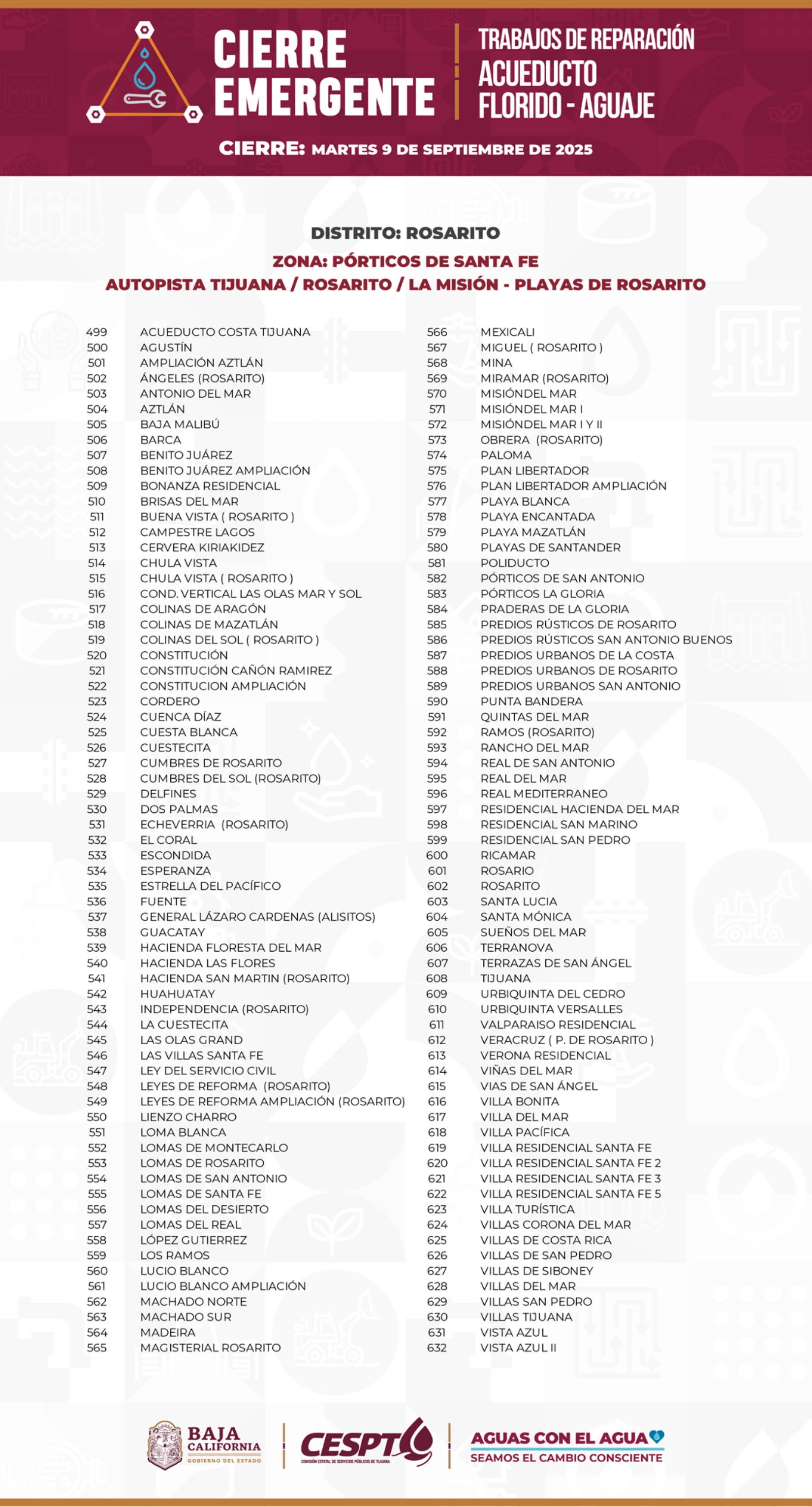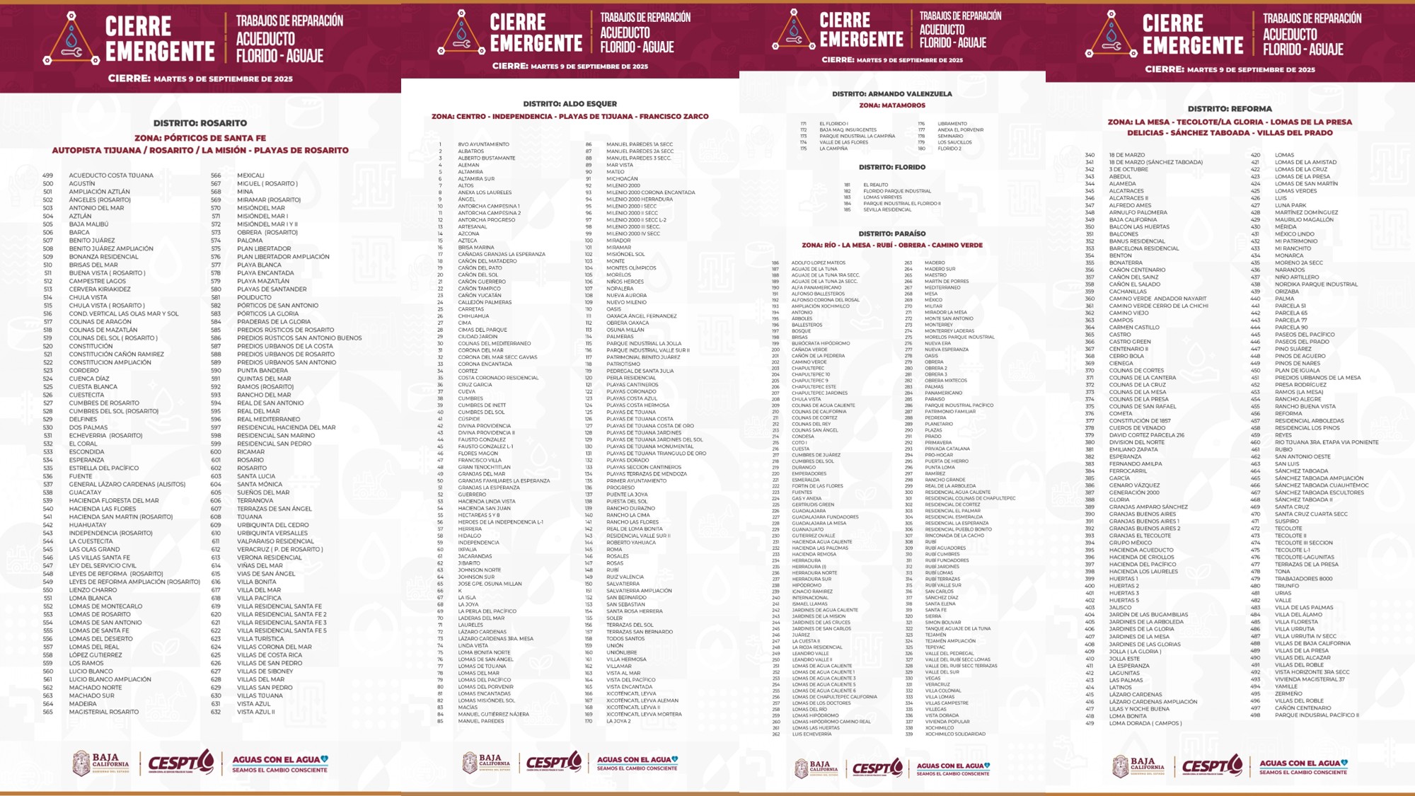 TIJUANA BC 9 DE SEPTIEMBRE DE 2025 (AFN).- La Comisión Estatal de Servicios Públicos de Tijuana (CESPT) publicó un listado de las 632 colonias que se quedaron sin suministro de agua potable desde la mañana de este martes, debido a una enorme fuga en el acueducto Florido-Aguaje, en la colonia Terrazas de la Presa.