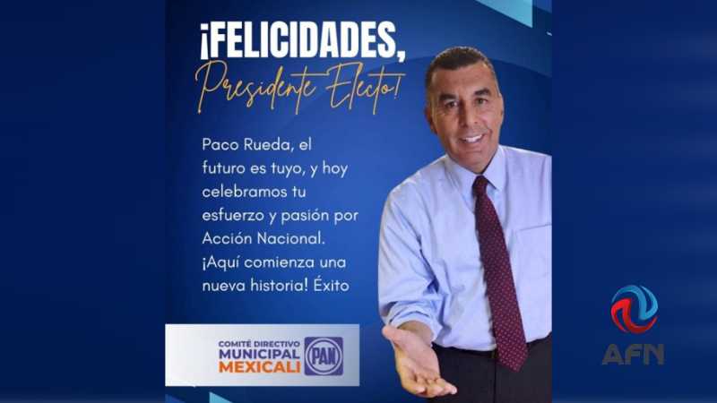 En un mensaje en redes sociales la presidenta del PAN en Mexicali, Vicky Quiñónez, felicitó a Rueda Gómez como presidente electo del Comité Directivo Municipal (CDM) del blanquiazul.