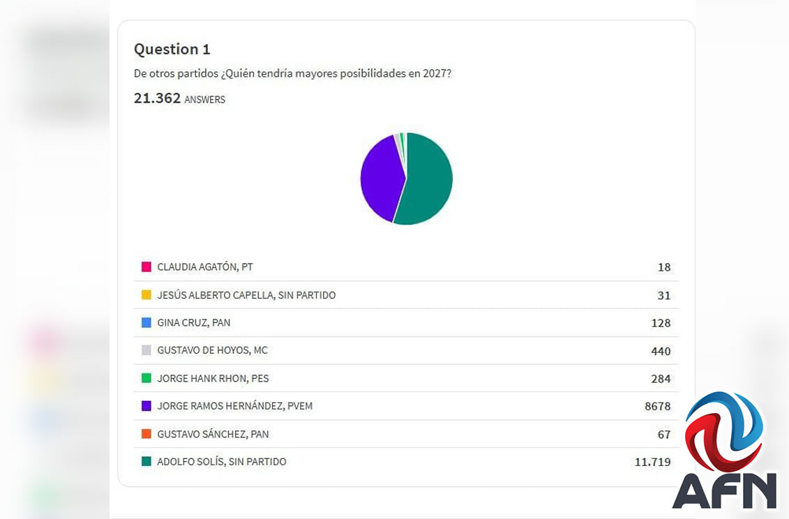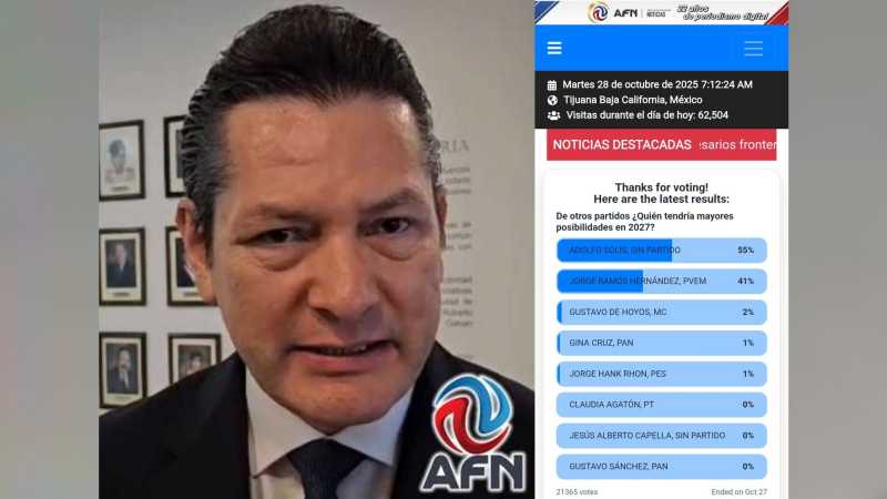 TIJUANA BC 28 DE OCTUBRE DE 2025 (AFN).- Finalmente el empresario Adolfo Solís Farías se impuso sobre el ex alcalde de Tijuana Jorge Ramos Hernández dentro de la nueva encuesta publicada por Agencia Fronteriza de Noticias (AFN) para conocer otras opciones de posibles candidatos para la gubernatura de Baja California en 2027.
