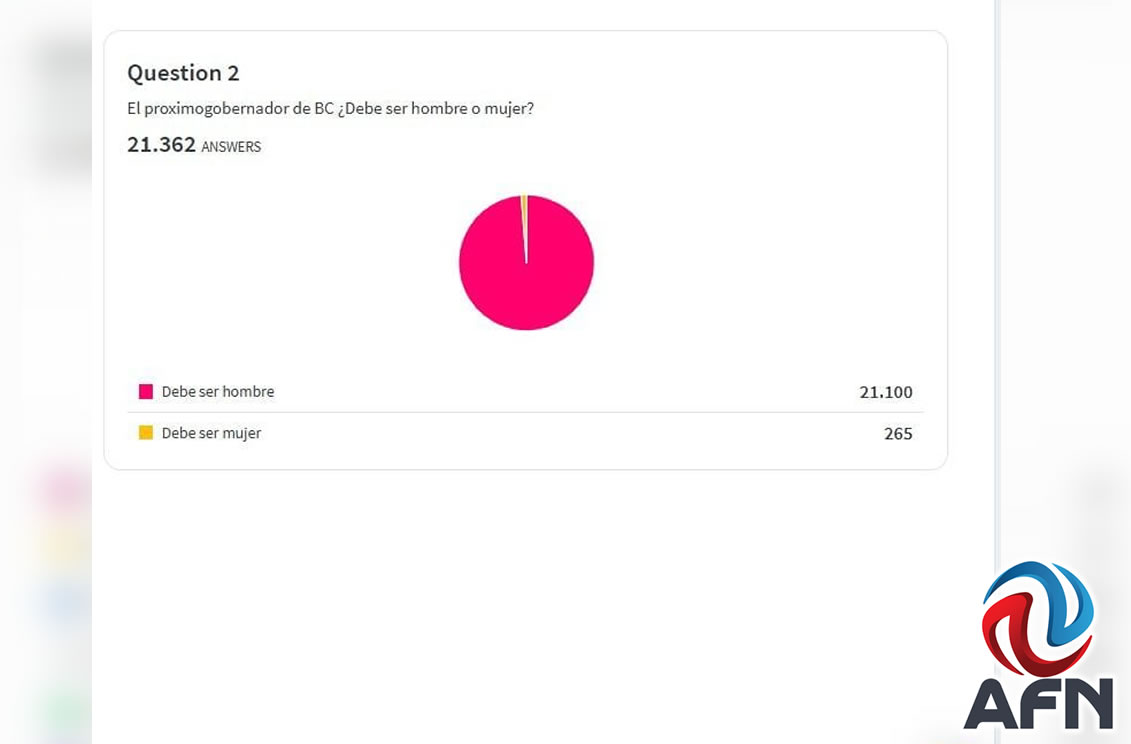 Por lo que respecta a la siguiente pregunta, en el sentido de que si el próximo gobernador de Baja California tendría que ser hombre o mujer 21,100 personas para dar un 99% señalaron que tendría que ser hombre y tan solo 265 con un 1% se inclinaron por una mujer.