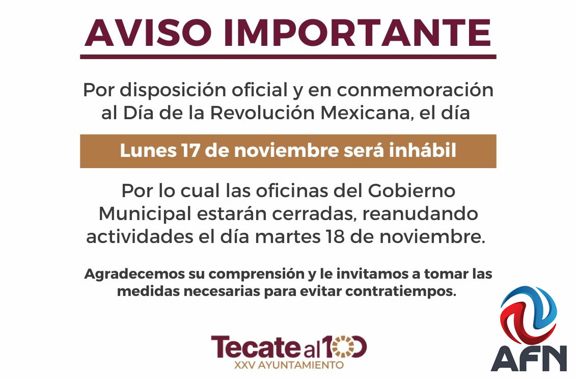 TECATE BC 13 DE NOVIEMBRE DE 2025 (AFN).- El gobierno de Tecate informó que el próximo lunes 17 de noviembre será día inhábil para el personal municipal, debido a la conmemoración del 20 de noviembre.
