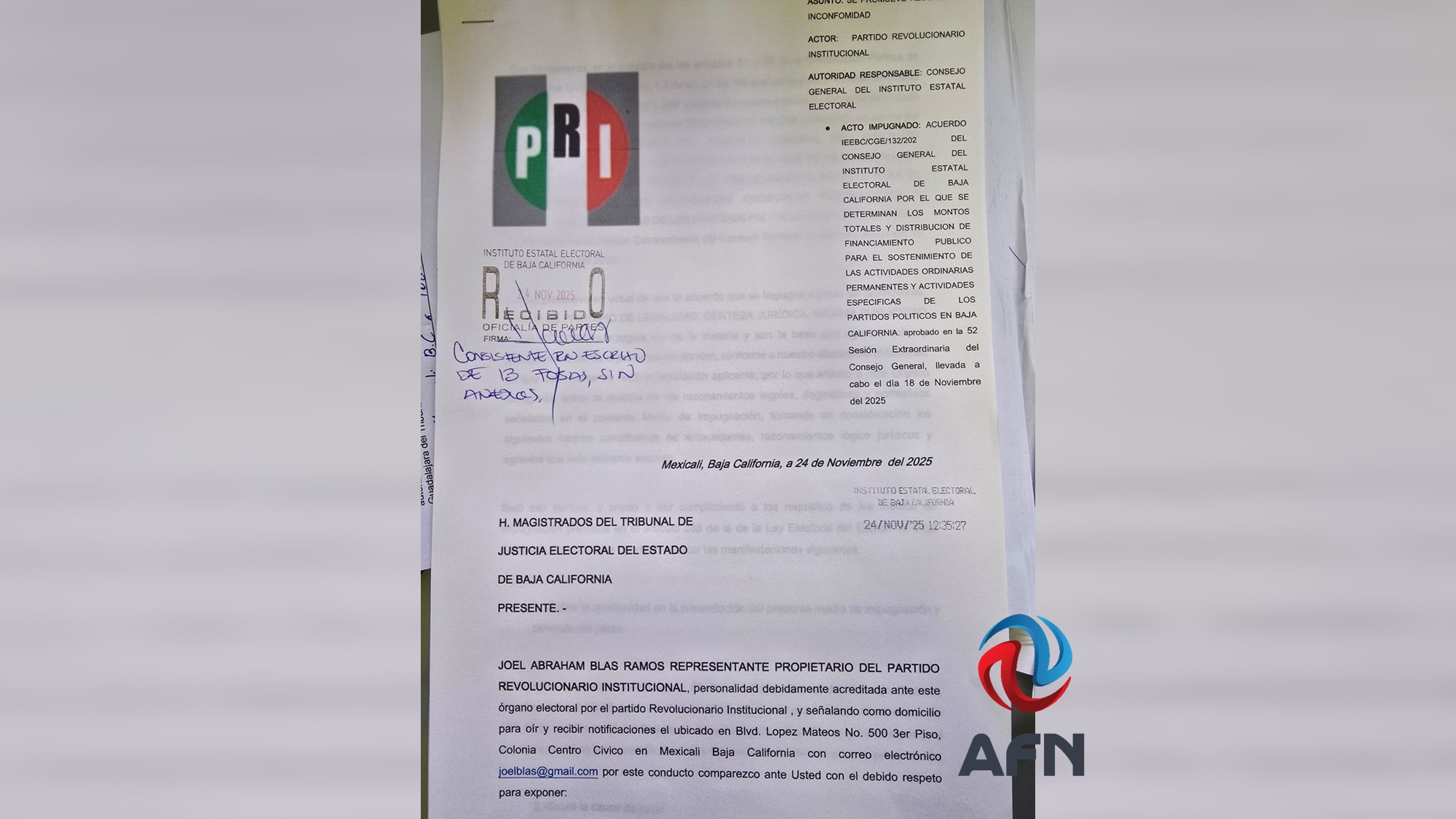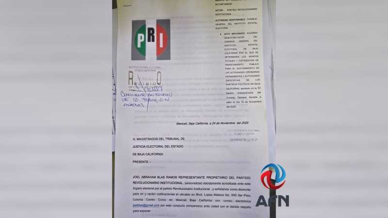 MEXICALI BC 24 DE NOVIEMBRE DE 2025 (AFN).- El Partido Revolucionario Institucional (PRI) en Baja California presentó un recurso de impugnación ante el Instituto Estatal Electoral (IEE), por los 80 millones de pesos que obtendría el Partido Encuentro Solidario como parte de su financiamiento público.