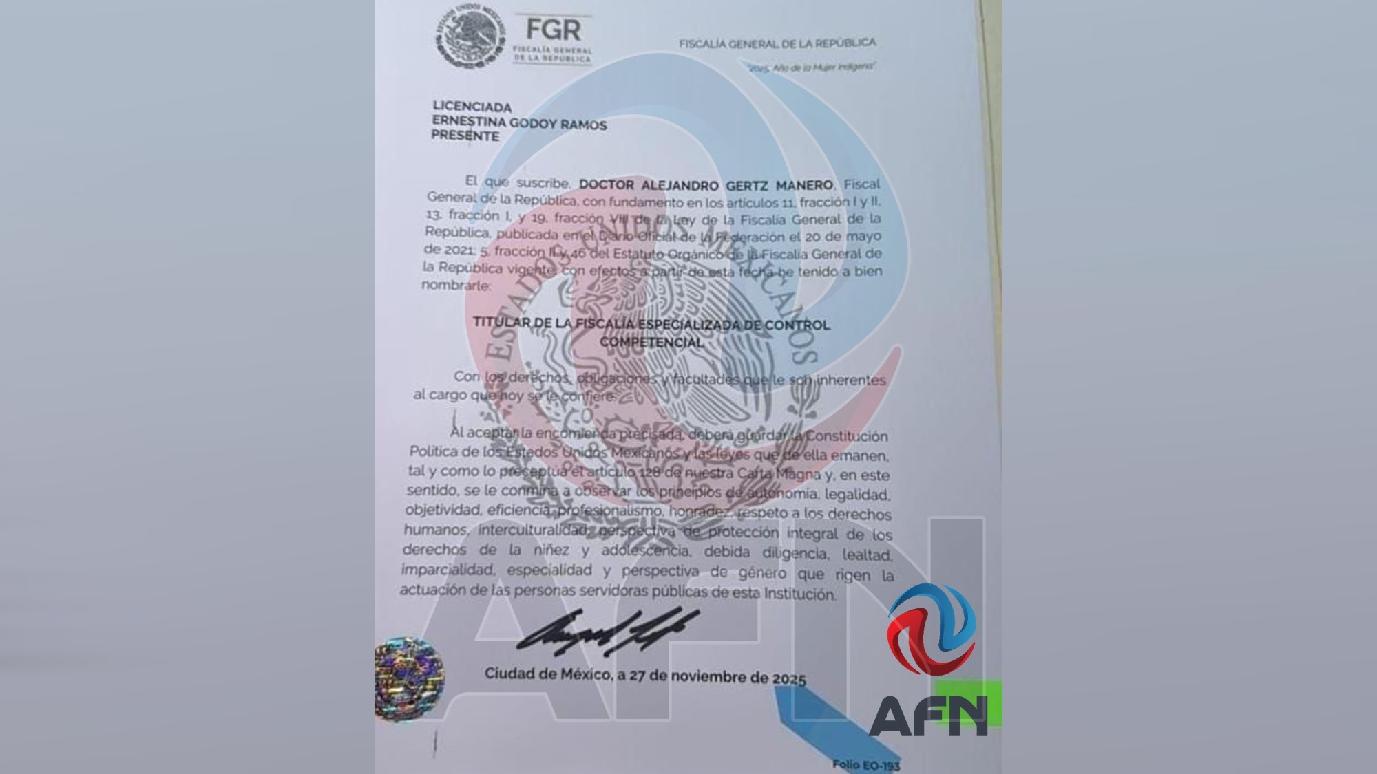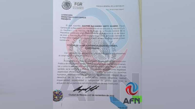 El documento, emitido este mismo jueves 27 de noviembre y firmado por Gertz Manero, aún en su calidad de titular de la FGR, notifica a Ernestina Godoy su nombramiento, y según la ley orgánica de la dependencia, ante la ausencia de su titular quien ocupe dicha fiscalía especial quedará como encargada de oficina.