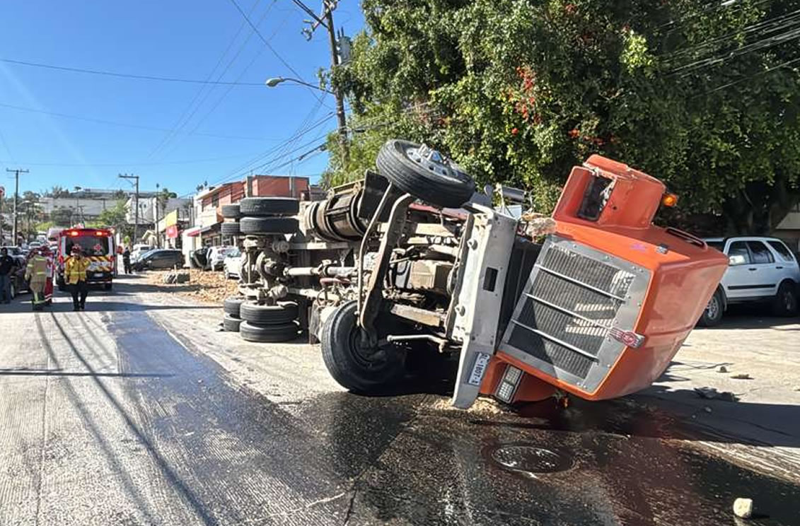 TIJUANA BC 6 DE MARZO DE 2026 (AFN).- Un camión tipo dompe terminó volcado en la colonia De los Arcángeles, en un accidente donde estuvieron involucrados otros seis vehículos; hubo dos personas lesionadas, ninguna de gravedad.