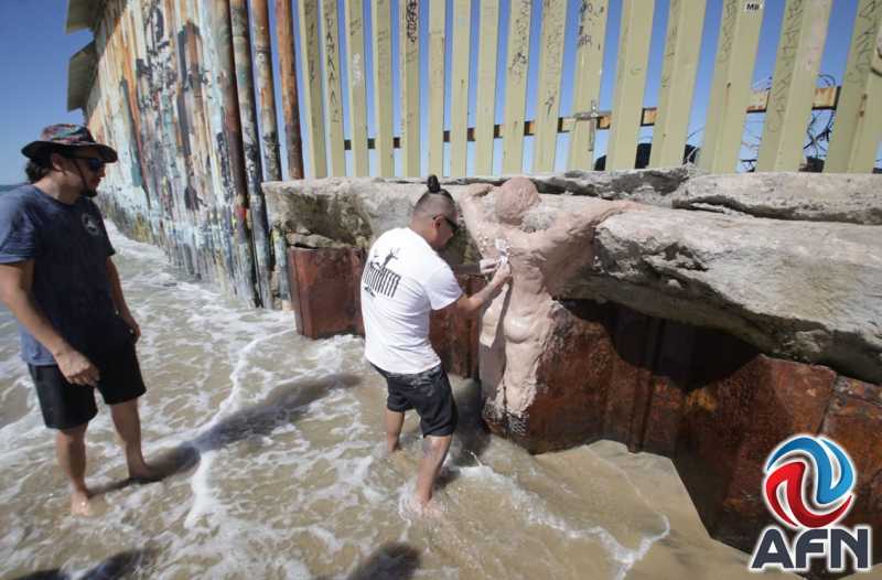TIJUANA BC 7 DE MARZO DE 2026 (AFN).- Un grupo de artistas y activistas chicanos realizó este sábado una intervención artística en el muro fronterizo de Playas de Tijuana, donde construyeron una escultura de arcilla con objetos simbólicos para reflexionar sobre la experiencia migrante y la memoria de quienes han cruzado la frontera entre México y Estados Unidos.