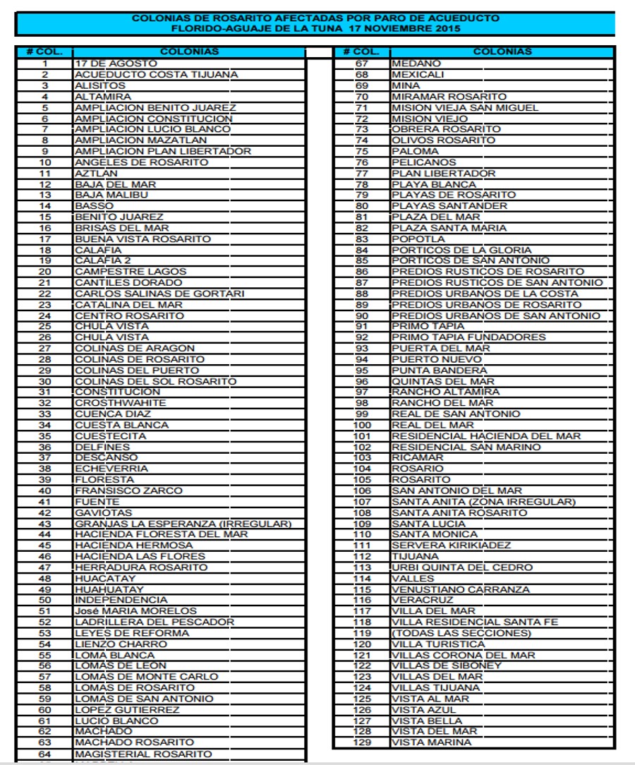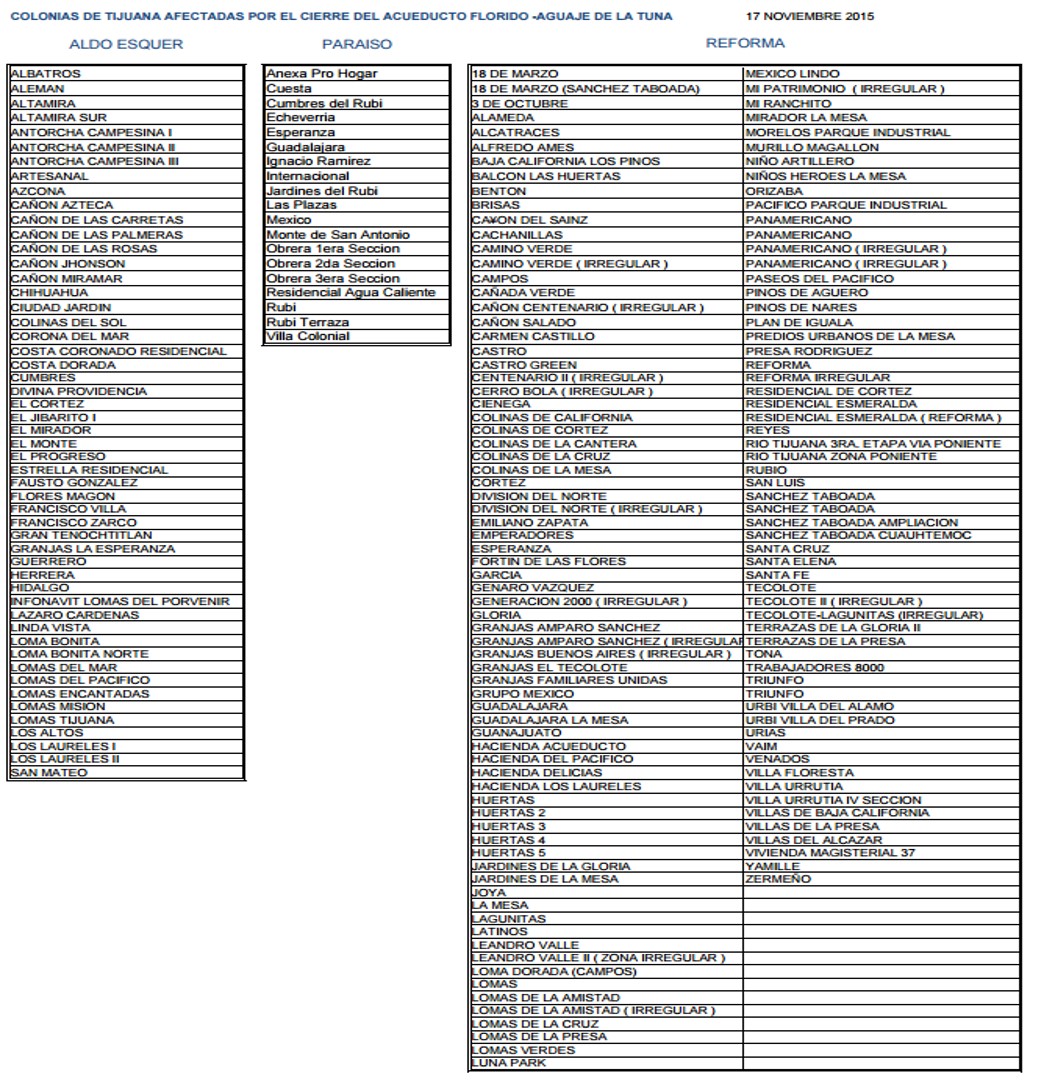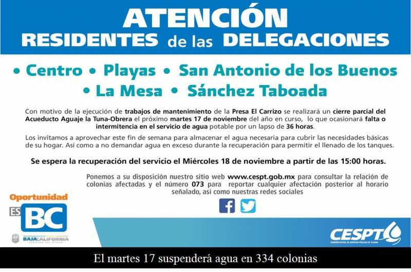 TIJUANA BC 15 DE NOVIEMBRE DE 2015 (AFN).- La Comisión Estatal de Servicios Públicos de Tijuana (Cespt), anunció que suspenderá el servicio de agua el martes 17 de noviembre a las 07:00 horas en 334 colonias de Tijuana y Playas de Rosarito, derivado de trabajos de mantenimiento en el acueducto de la Tuna-Obrera que realizará la Comisión Nacional del Agua (Conagua) en la Presa “El Carrizo”.