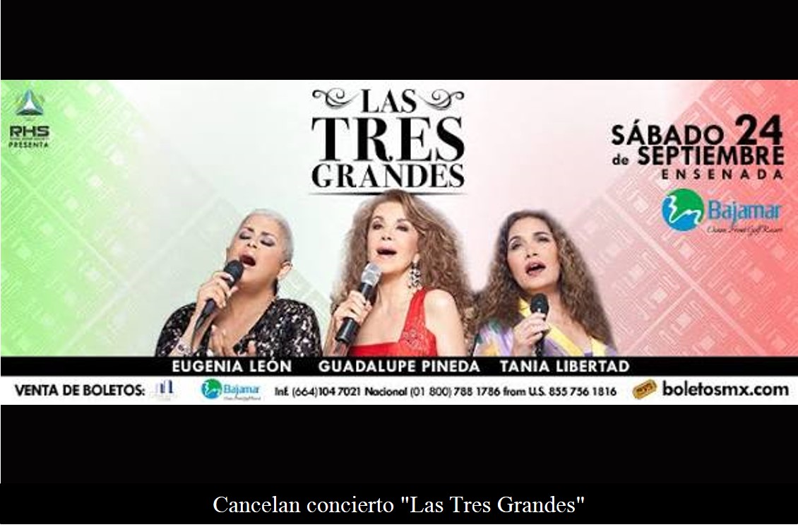 ENSENADA BC 23 DE SEPTIEMBRE DE 2016 (AFN).- El concierto denominado "Las Tres Grandes”, integrado por las reconocidas artistas Eugenia León, Guadalupe Pineda y Tania Libertad, fue cancelado por carecer de permisos y dictámenes de Seguridad Pública, Protección Civil y Bomberos.