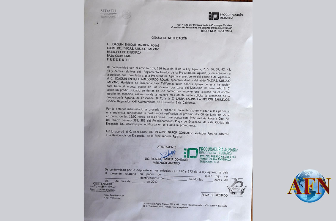 TIJUANA BC 30 DE MAYO DE 2017 (AFN).- La nueva administración municipal de Ensenada, fue emplazada por la Procuraduría Agraria de la entidad, a responder por la acusación de haber invadido y entregado un predio del ejido Úrsulo Galván, a un comerciante, para la instalación de una licorería.