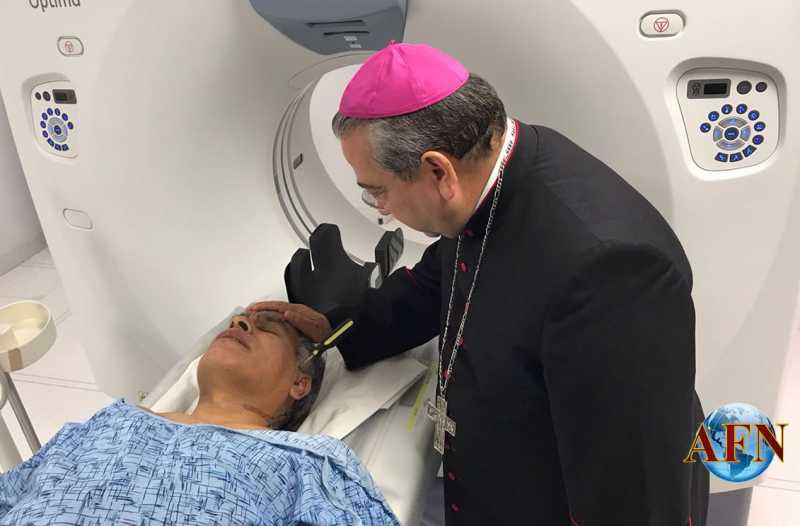 El Arzobispo Francisco Moreno Barrón, visitó la noche del jueves en la clínica del Issstecali, al sacerdote Toño Zambrano, quien fue agredido por un individuo con un desarmador, en la Parroquia de San Pedro y San Pablo en el Florido 1ra. Sección.