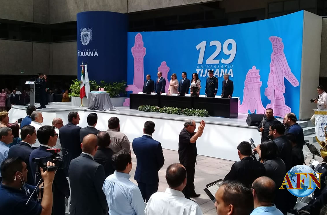 TIJUANA BC 11 DE JULIO DE 2018 (AFN).- Las festividades por el 129 aniversario de la fundación de Tijuana iniciaron con un acto cívico realizado en la explanada del Palacio Municipal, donde autoridades, funcionarios y personalidades de la ciudad se reunieron para conmemorar este hecho.