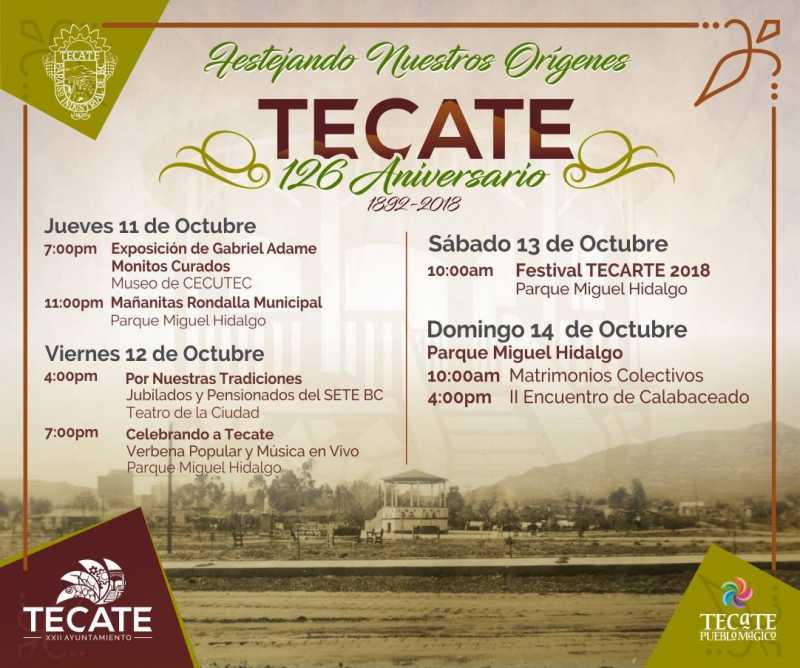 TECATE BC 8 DE OCTUBRE DE 2018 (AFN).- El Gobierno de Tecate conmemorará el 126 aniversario de su fundación con un programa de cuatro días de actividades para las familias nativas, residentes y visitantes bajo el lema “festejando nuestros orígenes”, del jueves 11 al domingo 14 de octubre del año en curso.