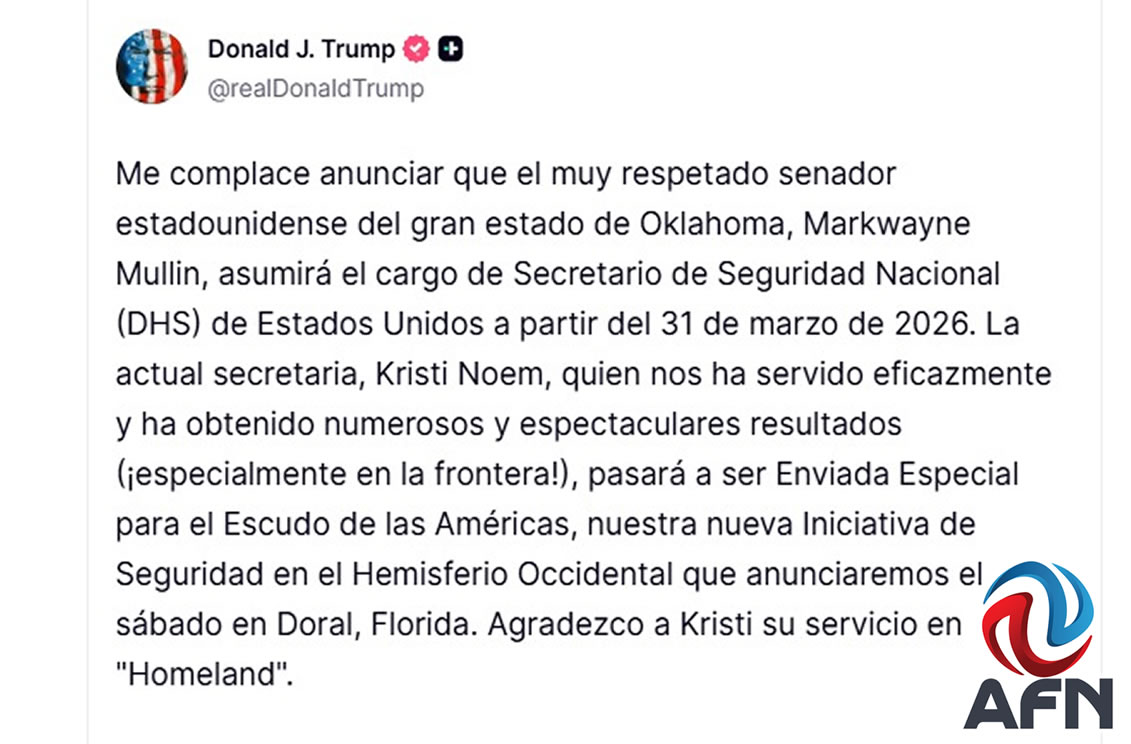 CIUDAD DE MÉXICO CDMX 5 DE MARZO DE 2026 (AFN).- El presidente Donald Trump anunció la destitución de Kristi Noem, como titular del Departamento de Seguridad Nacional de Estados Unidos (DHS); cargo donde fue designado el senador Markwayne Mullin.