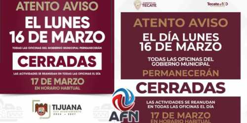 TIJUANA BC 14 DE MARZO DE 2026 (AFN).- Los gobiernos municipales de Tijuana y Tecate, anunciaron que el próximo lunes 16 de marzo día inhábil para el personal ...
