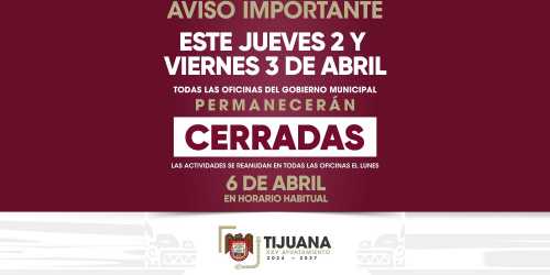 TIJUANA BC 1 DE ABRIL DE 2026 (AFN).- El ayuntamiento de Tijuana informó que los días jueves 2 y viernes 3 de abril serán de asueto para todo el personal, con ...