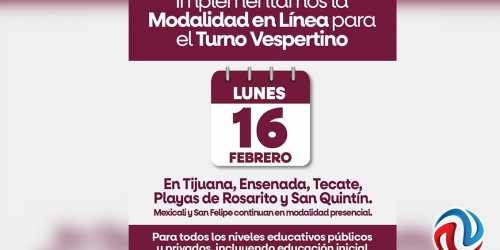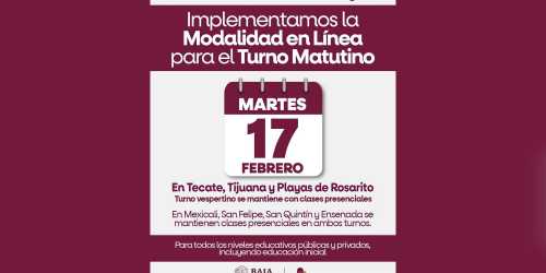 TIJUANA BC 16 DE FEBRERO DE 2026 (AFN).- Las clases del turno matutino se impartirán en modalidad en línea este martes 17 de febrero en Tecate, Tijuana y Playas ...