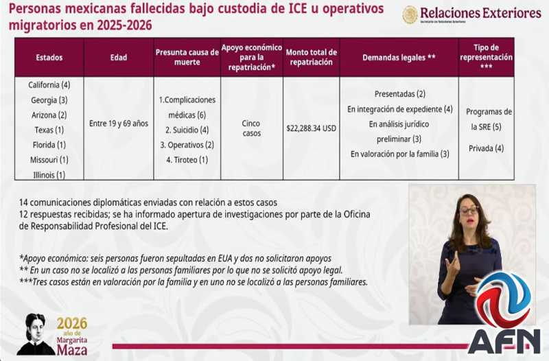 CIUDAD DE MÉXICO CDMX 25 DE MARZO DE 2026 (AFN).- De enero de 2025 a la fecha, 13 connacionales mexicanos han fallecido en Estados Unidos mientras estaban bajo custodia del Servicio de Inmigración y Control de Aduanas (ICE), según informes de la Secretaría de Relaciones Exteriores (SRE); en todos los casos, México ha exigido que se investiguen las causas.