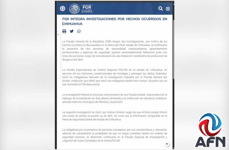 De acuerdo con un comunicado de la FGR -aunque no se especificó que sean agentes antidrogas de Estados Unidos, como ha trascendido-, se menciona que hubo extranjeros, caso que se investigará por medio de la Fiscalía Especializada de Control Regional (Fecor) en Chihuahua, por medio de su Fiscalía Especial de Investigación y Litigación de Casos Complejos, dadas "sus características y relevancia".