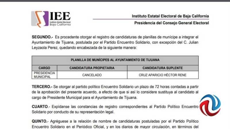 Si esto se confirma -como ya se dijo- el Partido Encuentro Solidario tendría un plazo de 72 horas contadas a partir de la aprobación de este para que sustituye al candidato al cargo de presidente municipal, para el ayuntamiento de Tijuana.