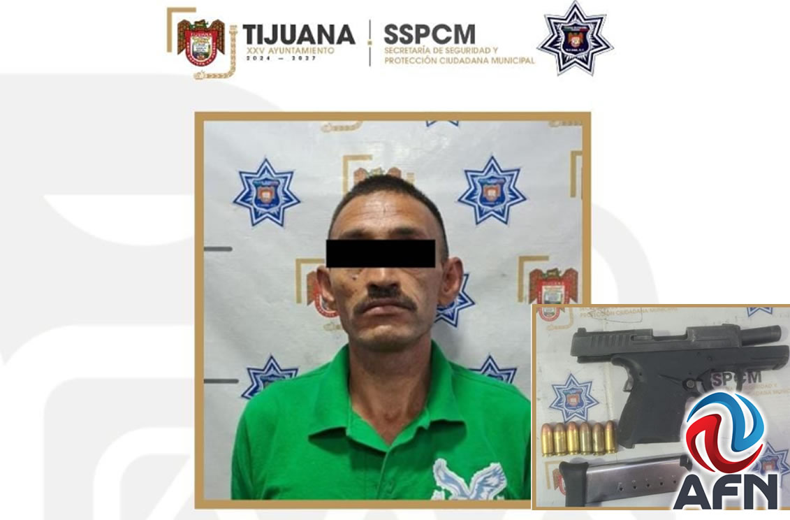 TIJUANA BC 28 DE OCTUBRE DE 2025 (AFN).- Oficiales de la Policía Municipal de Tijuana detuvieron a un hombre identificado como José Martín “N”, de 46 años, por amenazas y portación de arma de fuego en la colonia Sánchez Taboada; amenazó a su pareja sentimental con una pistola y pretendió ocultar el arma lanzándola al techo de la casa.