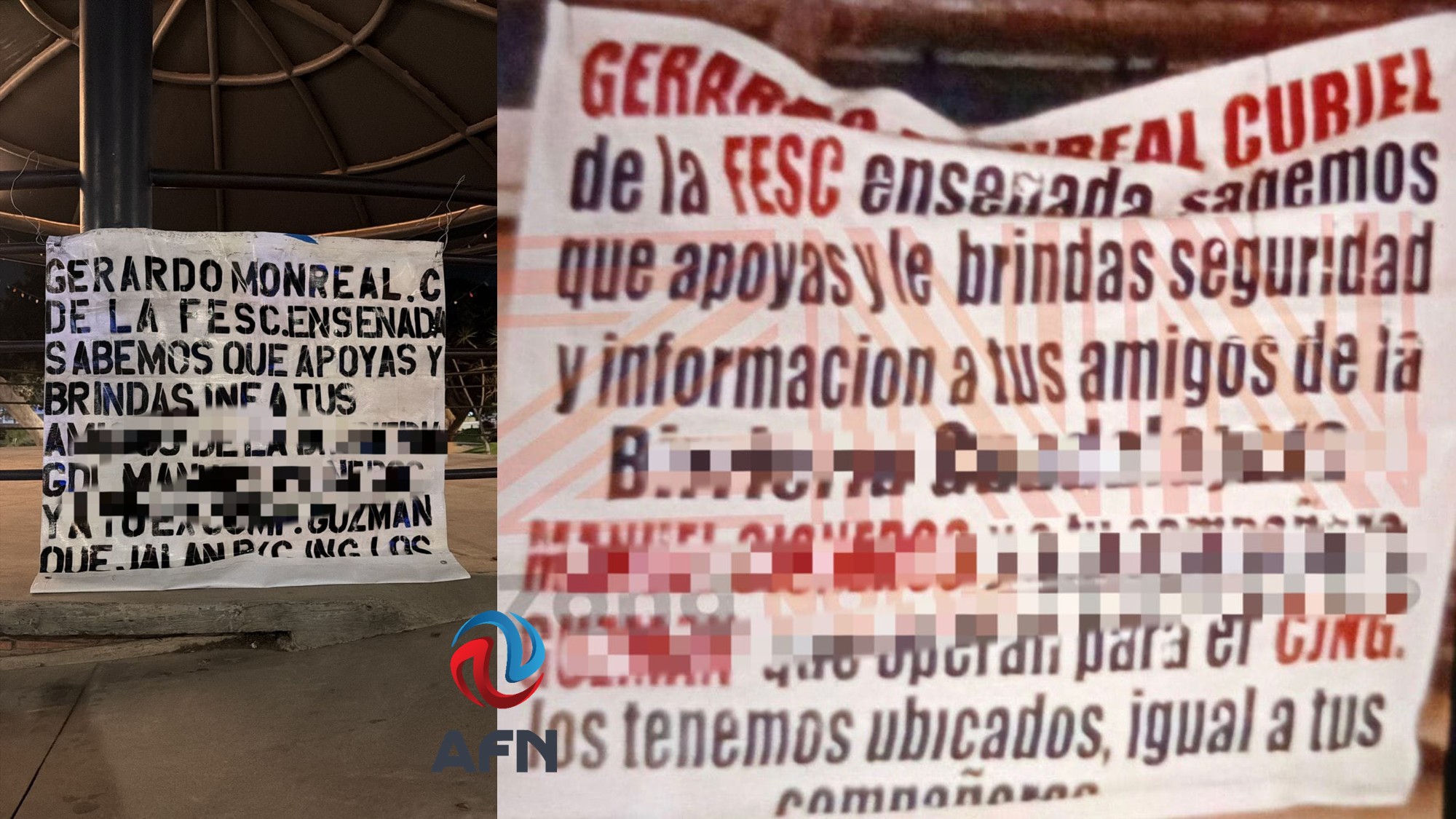 ENSENADA BC 7 DE NOVIEMBRE DE 2025 (AFN).- Al menos tres “narcomantas” dirigidas a un elemento de la Fuerza Estatal de Seguridad Ciudadana (FESC) fueron colocadas en diversos puntos de Ensenada, la noche de este viernes; el mensaje acusa una supuesta protección a un grupo criminal.
