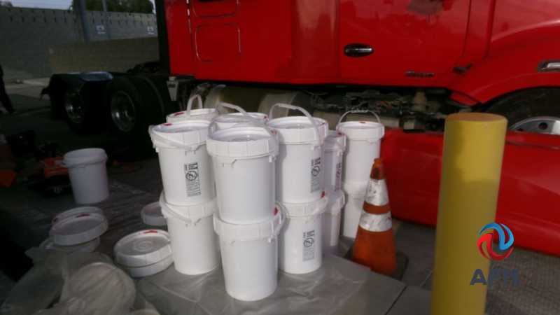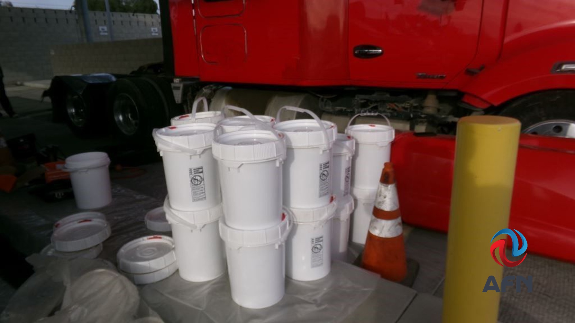 En total los agentes extrajeron 29 cubetas de cinco galones con la sustancia líquida del depósito de combustible, la cual dio positivo a metanfetamina, con un peso de 944 libras, equivalentes a 428 kilos.