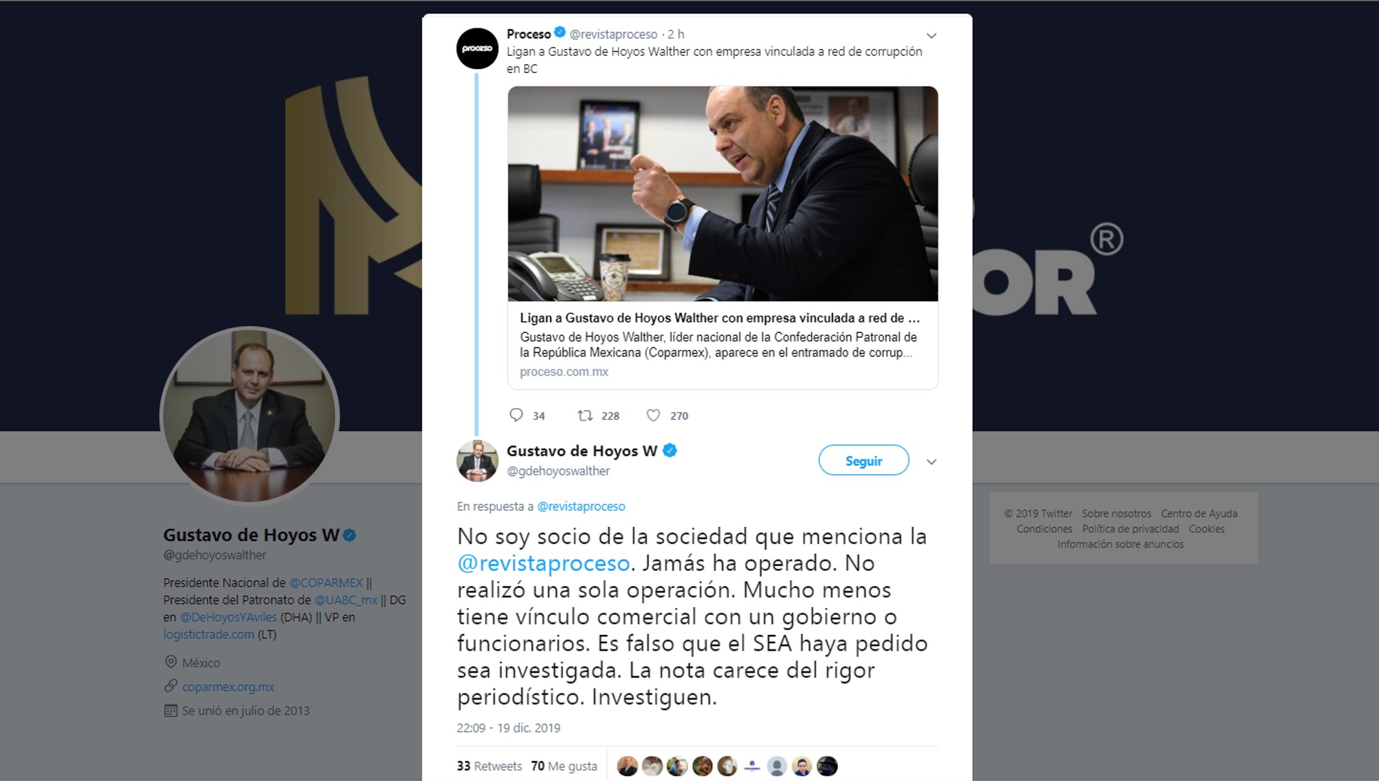 PD4.- Por cierto, el presidente nacional de la Coparmex, Gustavo de Hoyos Walther envió hoy una aclaración que publicó en Twitter, mediante la que desmiente la publicación que señala que circuló la revista Proceso, afirmando que: “No soy socio de la sociedad que menciona la revista Proceso. Jamás ha operado. No realizó una sola operación. Mucho menos tiene vínculo comercial con un gobierno o funcionarios. Es falso que el SEA haya pedido sea investigada. La nota carece del rigor periodístico. Investiguen.