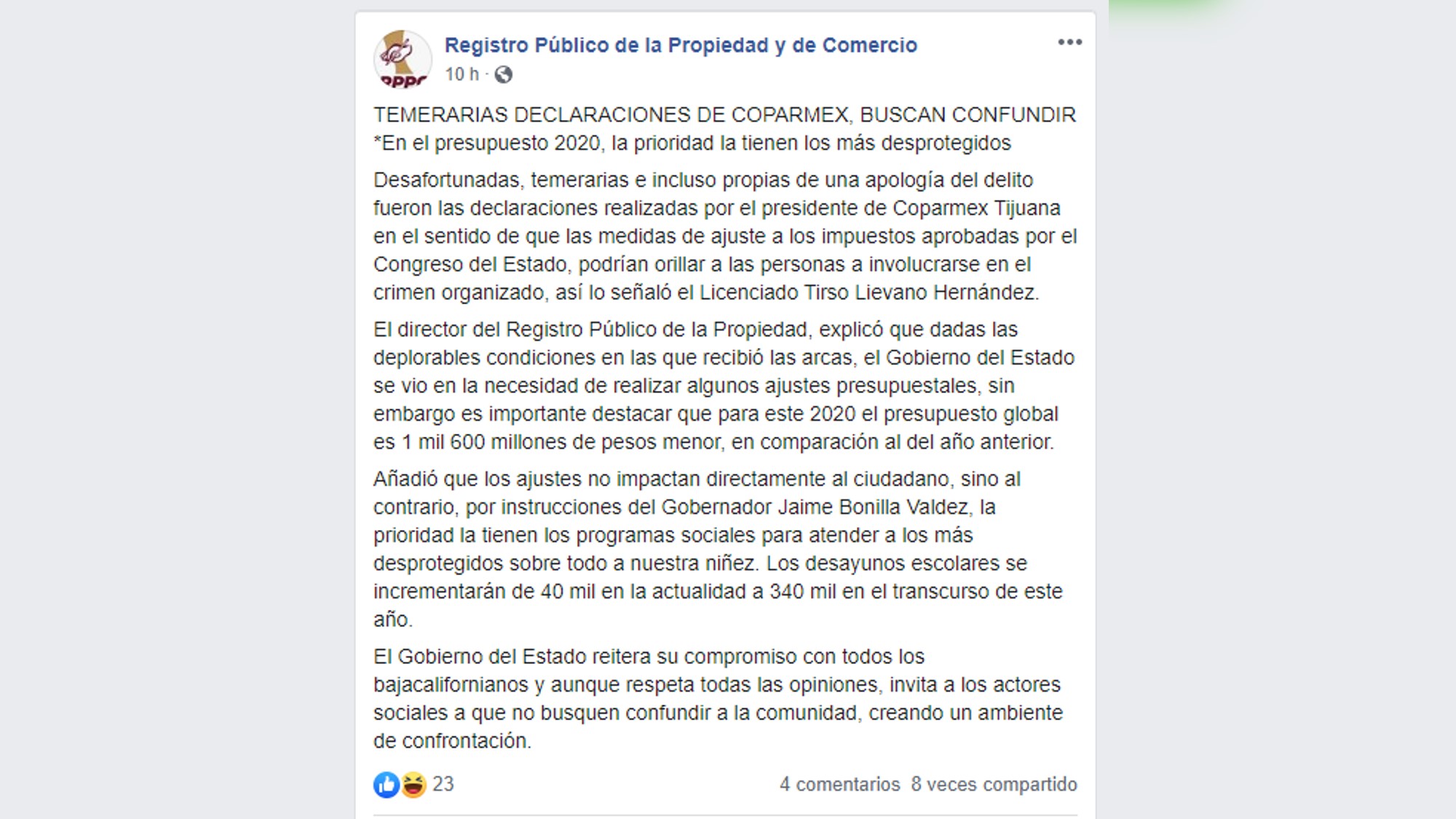PD4.- El director Estatal del Registro Público de la Propiedad y del Comercio, Tirso Liévano, se “subió al ring” este domingo para responder a unas declaraciones que hizo el presidente de la Coparmex local, Roberto Rosas, señalándolas de “desafortunadas, temerarias -e incluso- propias de una apología del delito”, ya que el representante empresarial comentó que el crear nuevos impuestos, y elevar otros, podría llevar a la población a inclinarse por grupos delictivos.
