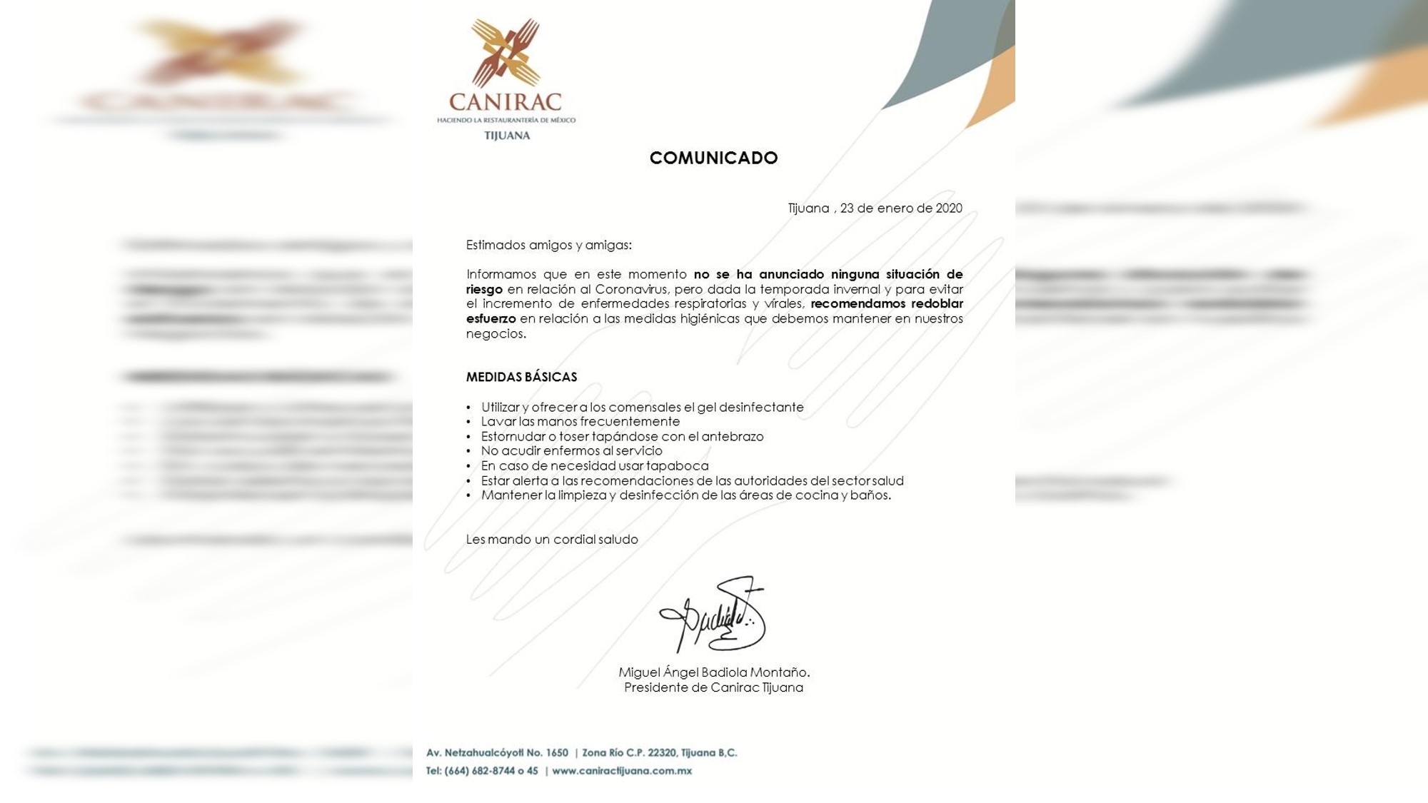 PD8.- Canirac estatal que dirige Miguel Ángel Badiola Montaño envió un comunicado a todos sus asociados recordándoles la importancia de atender todas las reglas de higiene para evitar riesgos de salud por el incremento de enfermedades en vías respiratorias, señalando que afortunadamente en Baja California no hay signos de presencia de coronavirus.