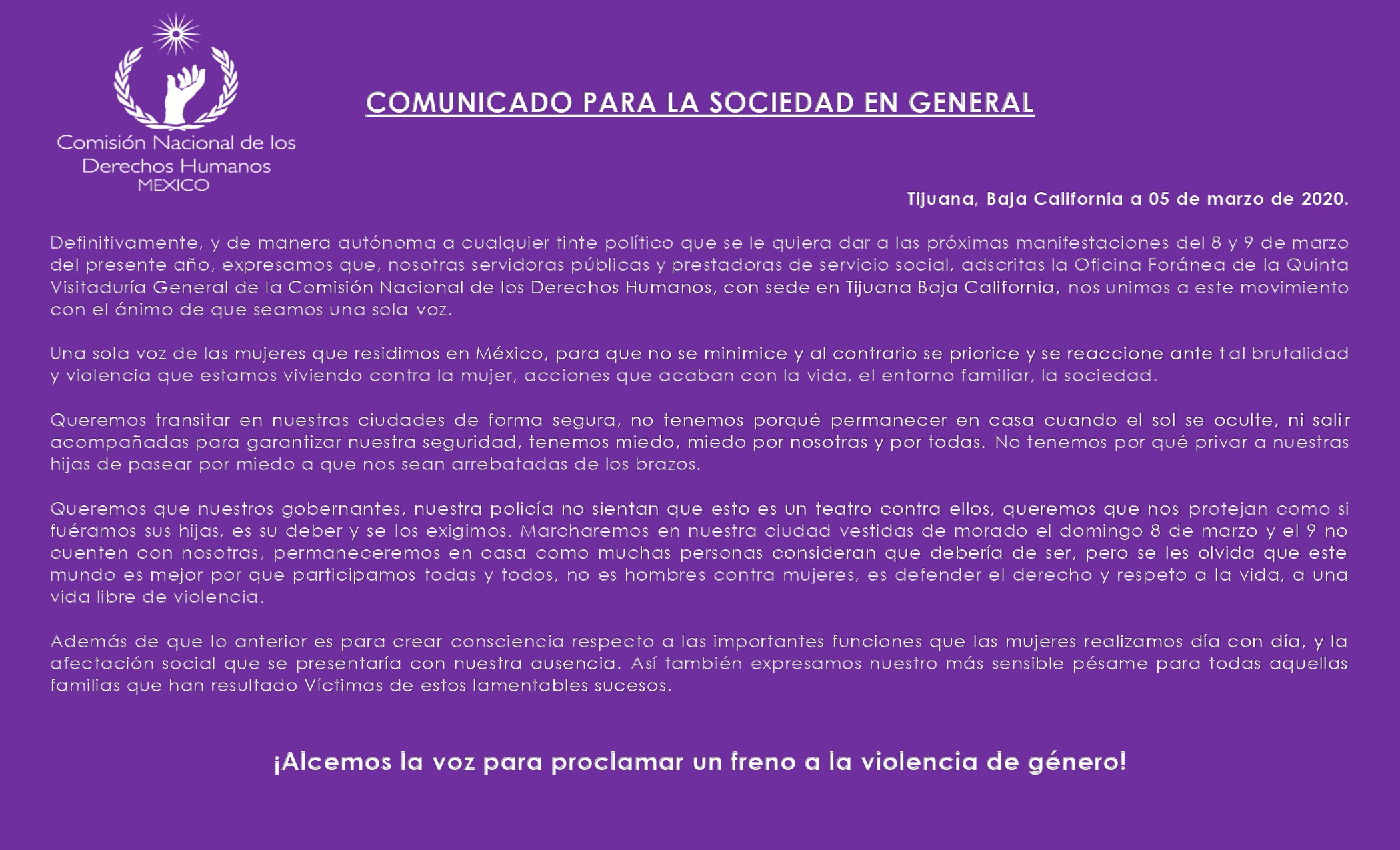 En el otro extremo, hay posiciones como el que nos hacen llegar la servidoras públicas y prestadoras de servicio social que se encuentran adscritas a la Oficina Foránea de la Quinta Visitaduría General de la Comisión Nacional de los Derechos Humanos (CNDH), con sede en Tijuana, que nos informan que al margen de cualquier “tinte político que se le quiera dar a las próximas manifestaciones del 8 y 9 de marzo”, se unirán a este movimiento “con el ánimo de que seamos una sola voz”. Así lo harán otros grupos organizados.