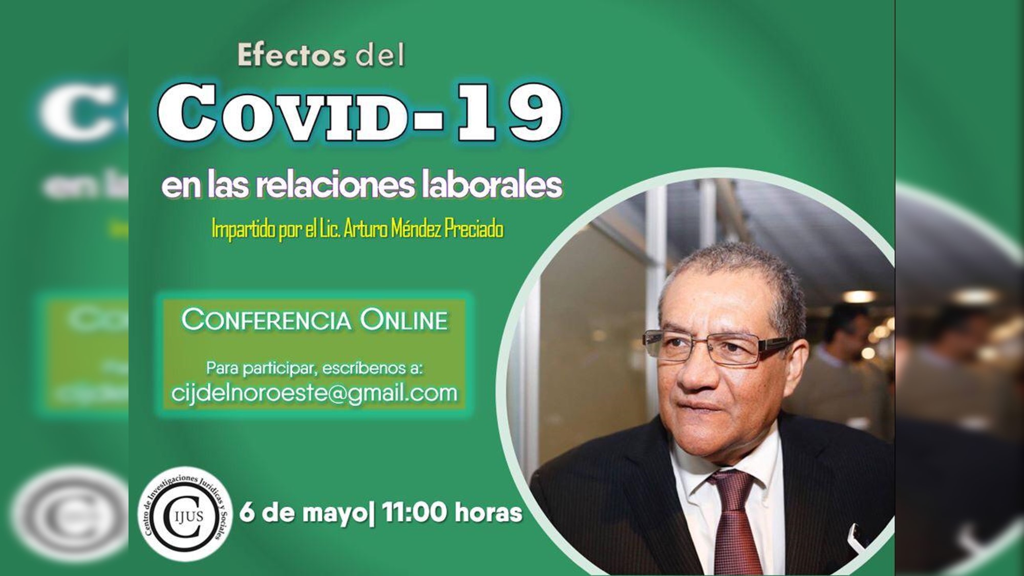 PD12.- Por otra parte, el licenciado Arturo Méndez Preciado ofrecerá una conferencia online sobre los efectos del Covid 19, en las relaciones laborales; esto es –igual- mañana miércoles a las 11 horas.
